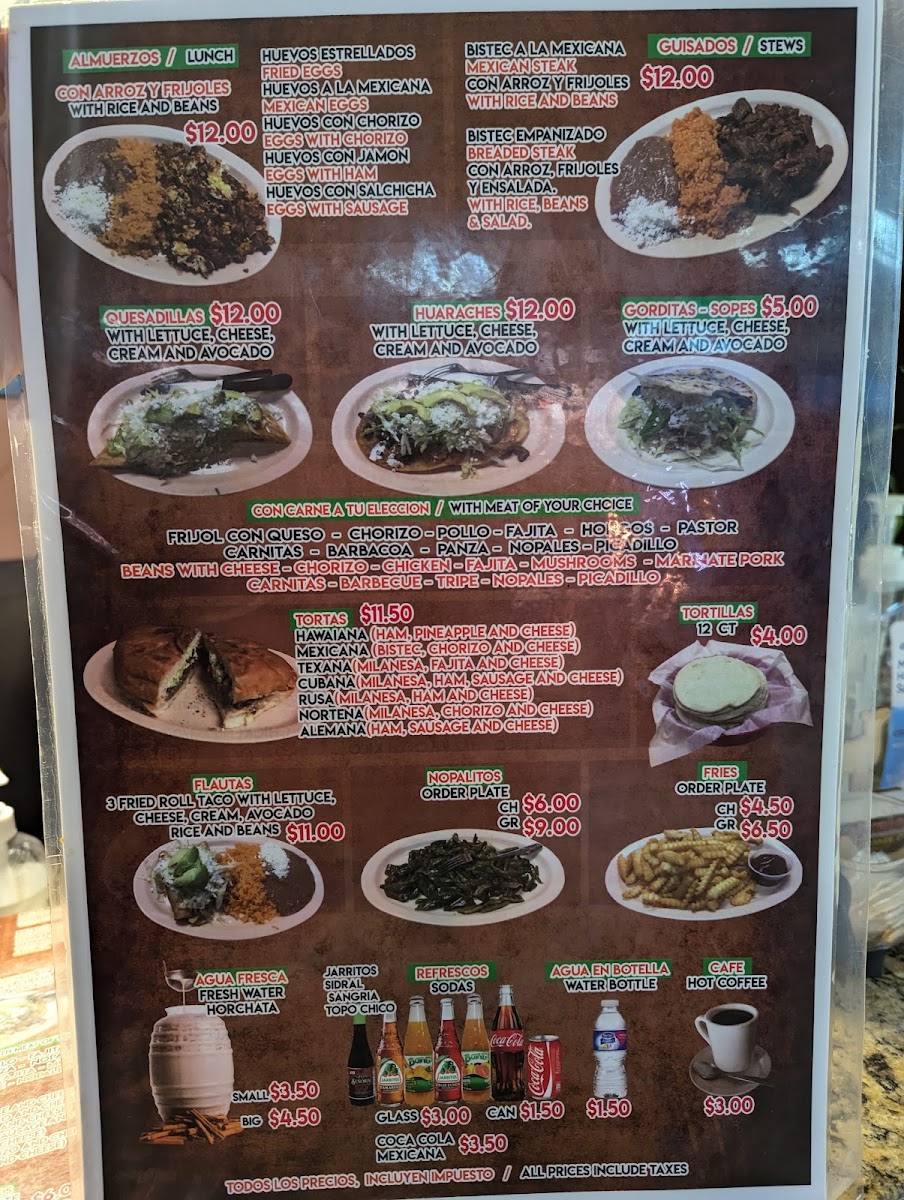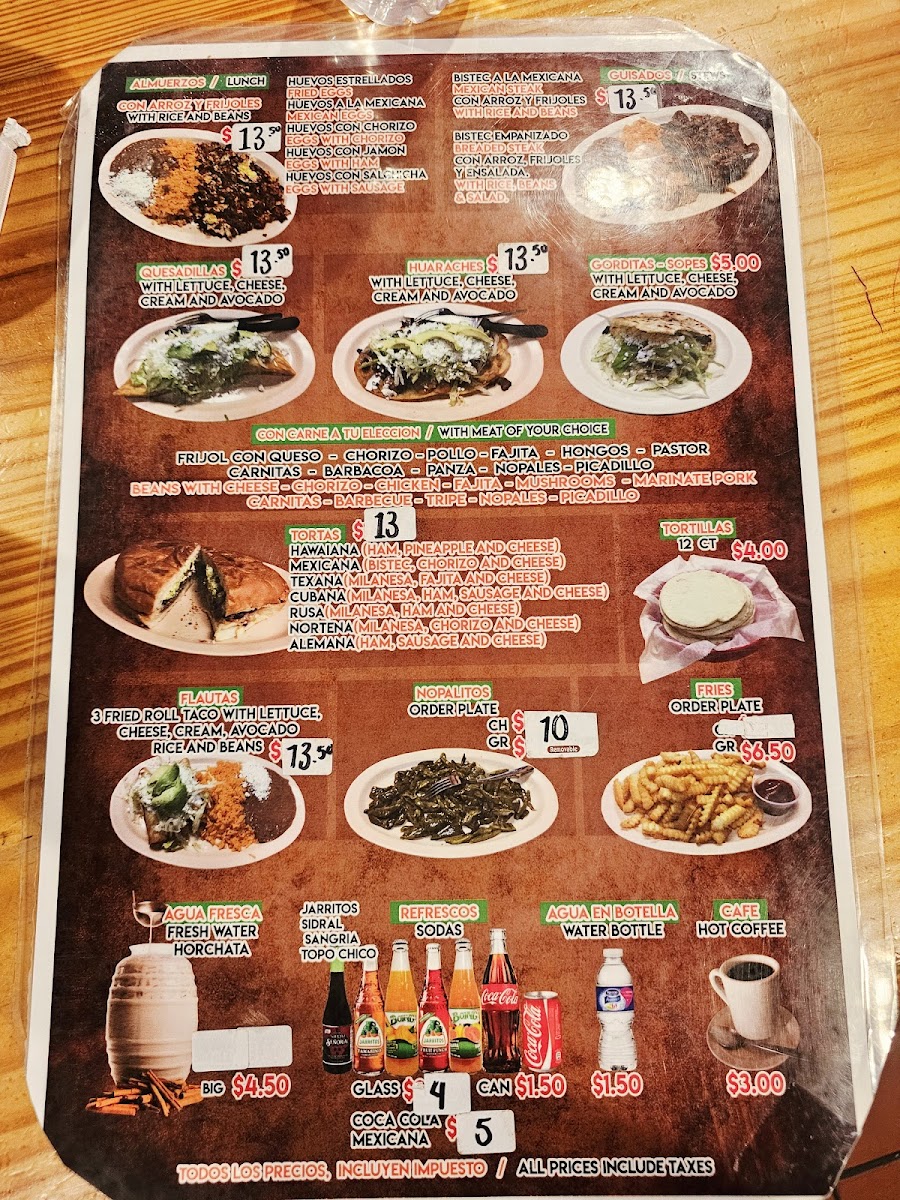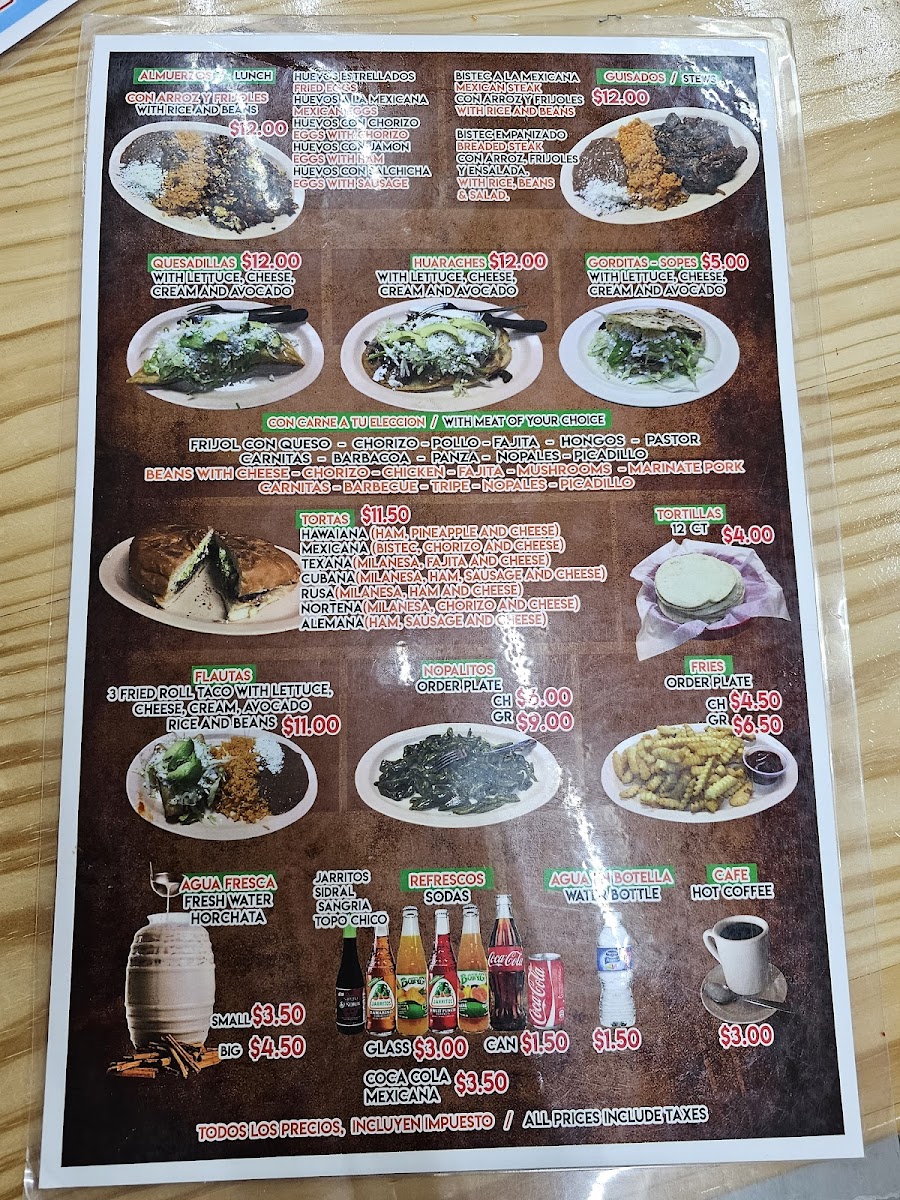 Beverages include traditional Mexican drinks such as café and Mexican Coca-Cola, as well as micheladas. The menu is suitable for breakfast and casual meals, offering options like scrambled eggs alongside heavier barbacoa dishes served with consomé. The combination of varied fillings and dish styles provides flexibility for quick orders or more relaxed dining experiences.